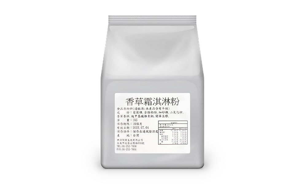 成分:葡萄糖、全脂奶粉、細砂糖、二氧化矽、香草香料、羧甲基纖維素鈉、關華豆膠